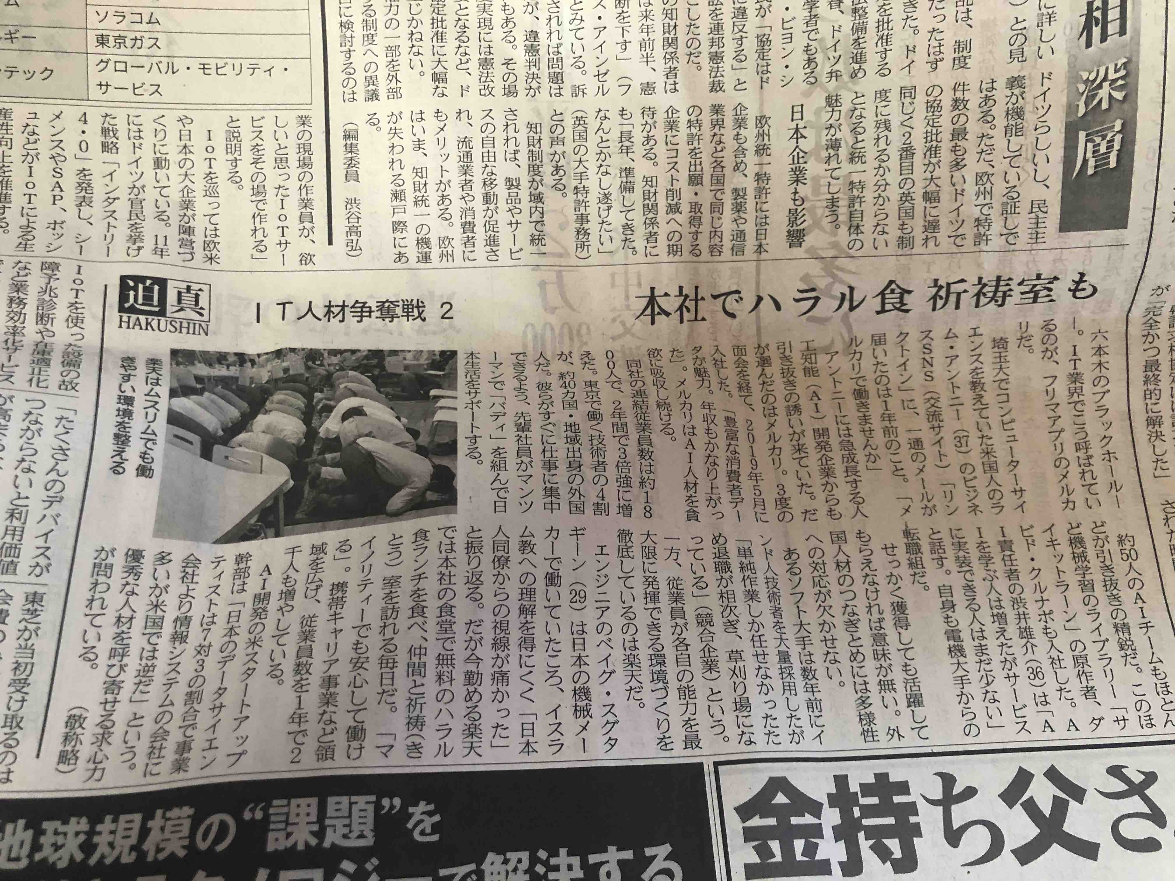 日経新聞抜粋 人材確保のため ハラル・祈祷室も用意