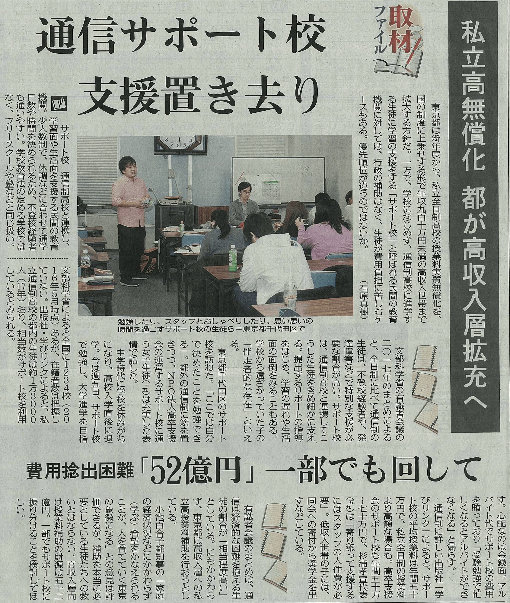 東京新聞では 不登校・高校中退・引きこもりの事実上の受け皿、通信制高校サポート校の支援は置き去りと訴えました。