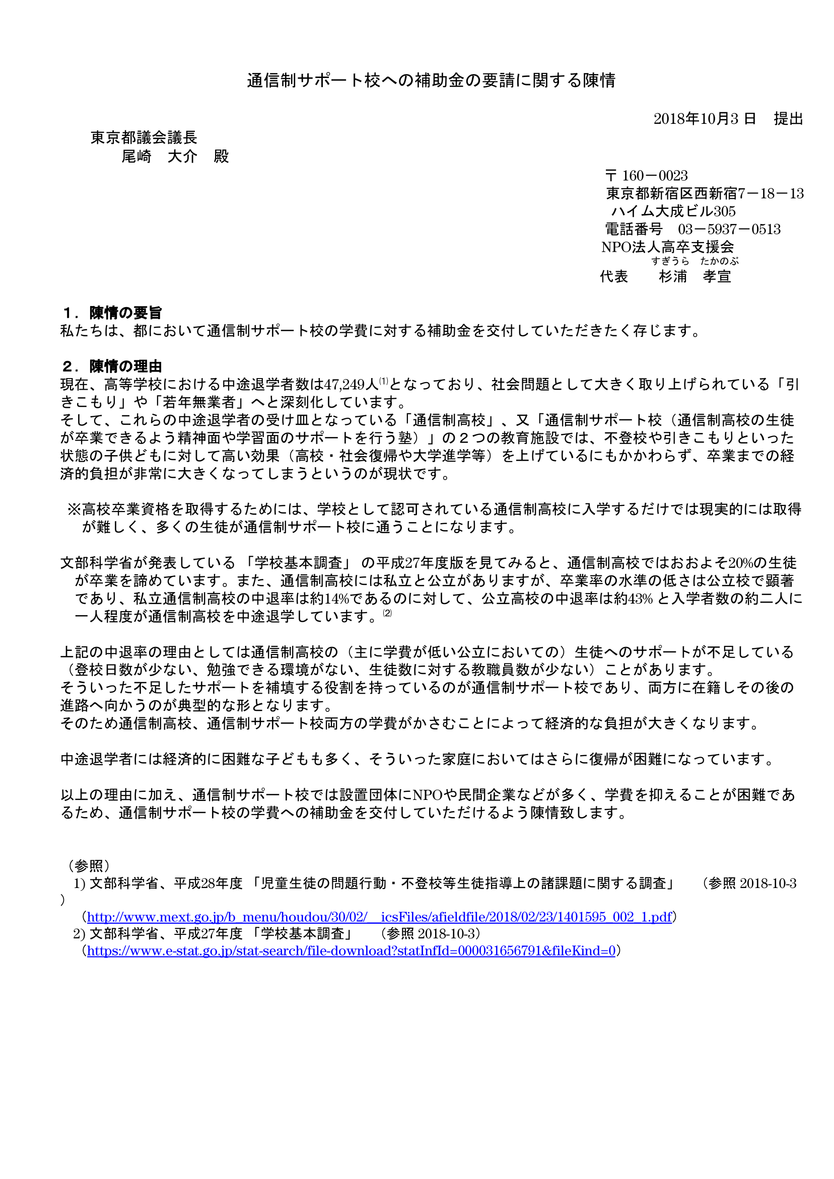 2018年10月 NPO法人高卒支援会 は東京都へ陳情を出しました。 通信制高校サポート校に通う、貧困世帯の助成願いです。ロビー活動もやりましたが、結果、ダメでした。
