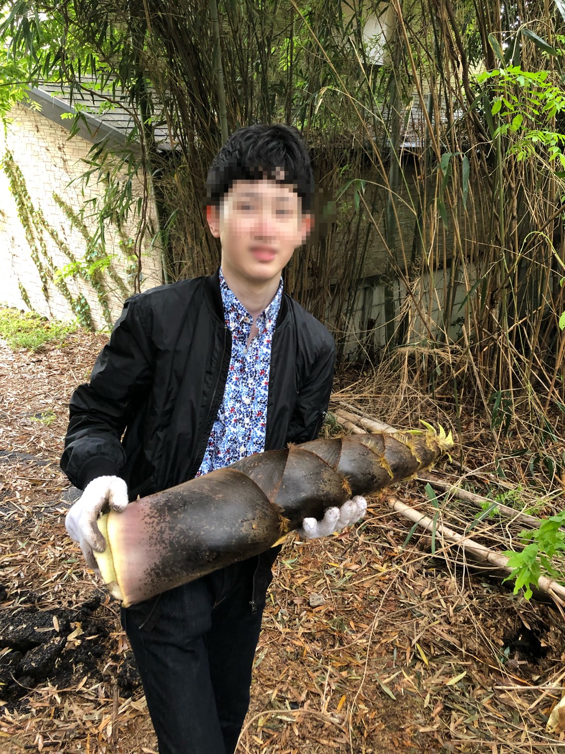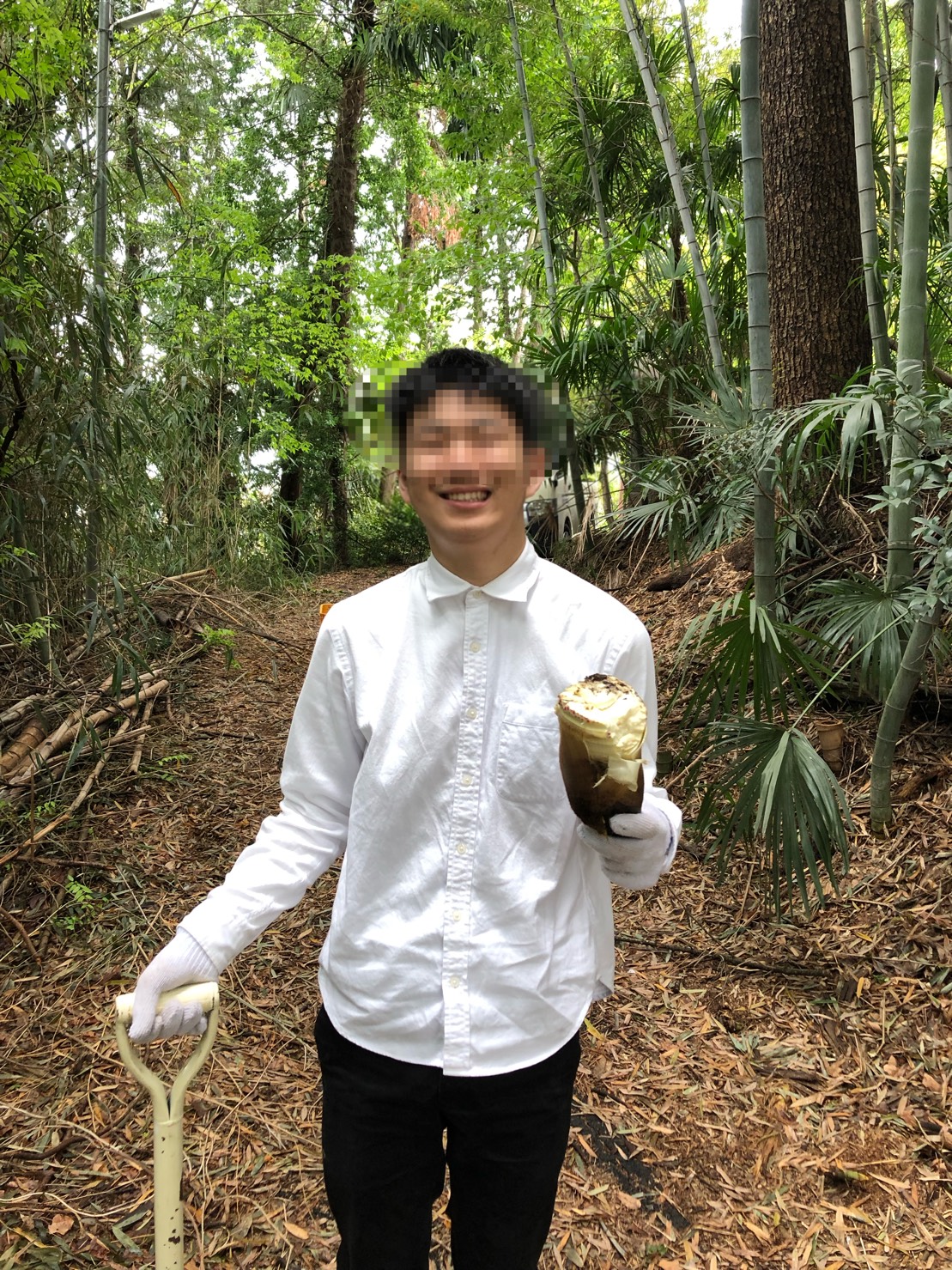 私も久しぶりにタケノコを掘りましたが、結構力や体力を使うんですよね、2本掘ったあたりで汗だくになってしまい、その横で生徒二人も汗まみれになりながらタケノコを掘っていました。