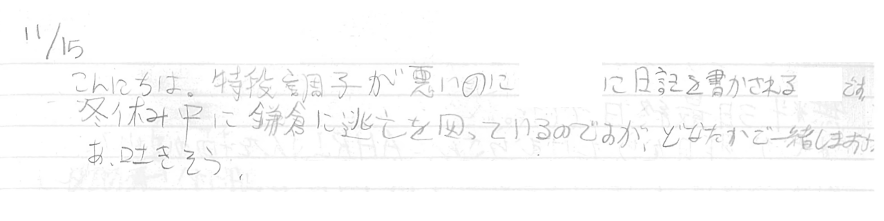 不登校塾・フリースクール 不登校中学・高校生の交換日記 @東京都新宿エルタワー・水道橋 その147 未分類 X Facebook はてブ Pocket LINE コピー 2019.05.22 [冒頭文] 2018年11月15日(木) T.M君 こんにちは。特段調子が悪いのに__に日記を書かされるT.Mです。 冬休み中に鎌倉に逃亡を図っているのですが、どなたかご一緒しますか? あ、吐きそう [文末(水道橋用)]