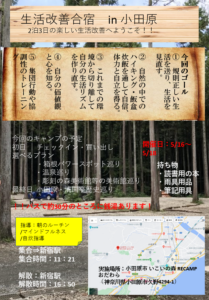 いよいよ新しい形の生活改善合宿がスタートしようとしています。以前の高卒支援会では、社会福祉法人日の出太陽の家様にご協力を頂いて運営していましたが、もう少し参加費とレクリエーション要素を盛り込みたいという意見の下にキャンプ型に切り替えられました。場所はReキャンプ小田原で2泊3日、日程は