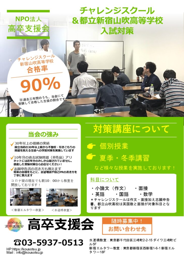 チャレンジスクール&都立新宿山吹高等学校入試対策講座 チャレンジスクール&都立新宿山吹高等学校入試対策講座 当会では、チャレンジスクールや都立新宿山吹高等学校の入試対策講座を実施いたします。対策講座は、個別授業や夏季・冬季の講習など様々な授業を実施いたします。科目など詳細はスタッフまでお問い合わせください。受付はこちらからお願いいたします。HP :https://sawa.lifes-sample.com TEL :03-5937-0513Mail : info@kousotsu.jp
