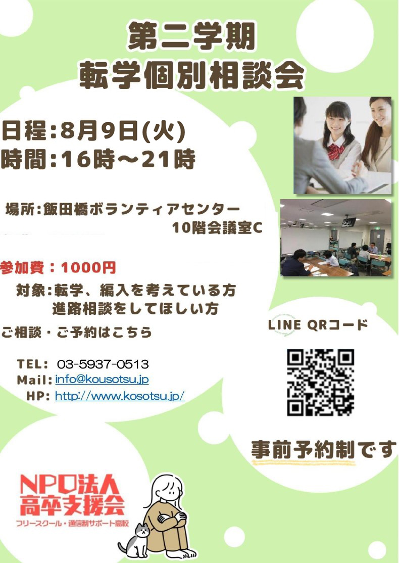 8月9日 第二学期 転学個別相談会 第二学期 転学個別相談会 日時:8月9日(火)16時~21時 会場:東京ボランティア・市民活動センター 会議室C 参加費:1000円 対象者:中学生・高校生 相談内容:不登校、引きこもりになってしまい、不安を感じている方、勉強の進め方が気になる方、解決方法を見つけたい方など 生徒や親御様と話し合って、一緒に納得のいく転学先を見つけましょう。 ※事前予約制ですのでお早めにご連絡下さい。 受付はこちらからお願いいたします。TEL:03-59370513Email:info@kousotsu.jp