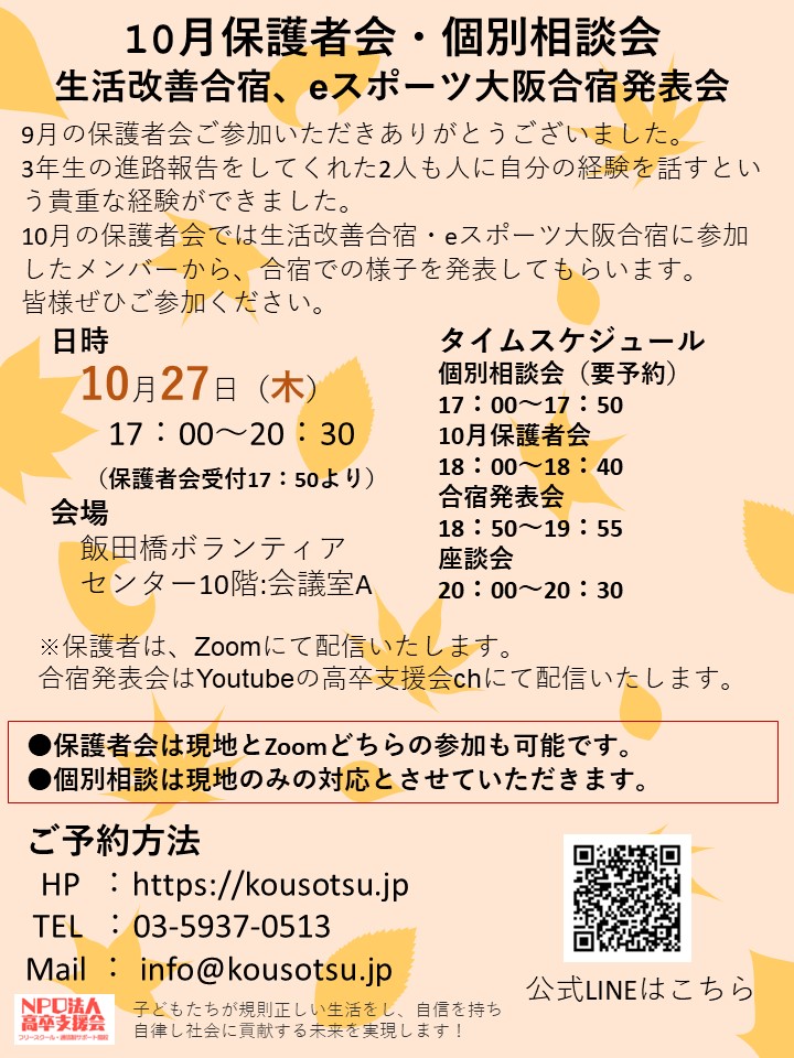 10月27日 10月保護者会・個別相談会・生活改善合宿、eスポーツ大阪合宿の発表会を開催 10月27日 10月保護者会・個別相談会・生活改善合宿、eスポーツ大阪合宿の発表会を開催 日時:10月27日(木)17:00~20:30(保護者会受付は17:50より、合宿発表会の受付は18:40より)会場:飯田橋ボランティアセンター10階:会議室A タイムスケジュール個別相談会(要予約)17:00~17:5010月保護者会18:00~18:40合宿発表会18:50~19:55座談会20:00~20:30 参加方法 HP :https://sawa.lifes-sample.com TEL :03-5937-0513Mail : info@kousotsu.jp 当日は現地での参加だけではなく、保護者会はZoomで、合宿の発表会はYoutubeにて配信いたしますので、ぜひご参加ください。
